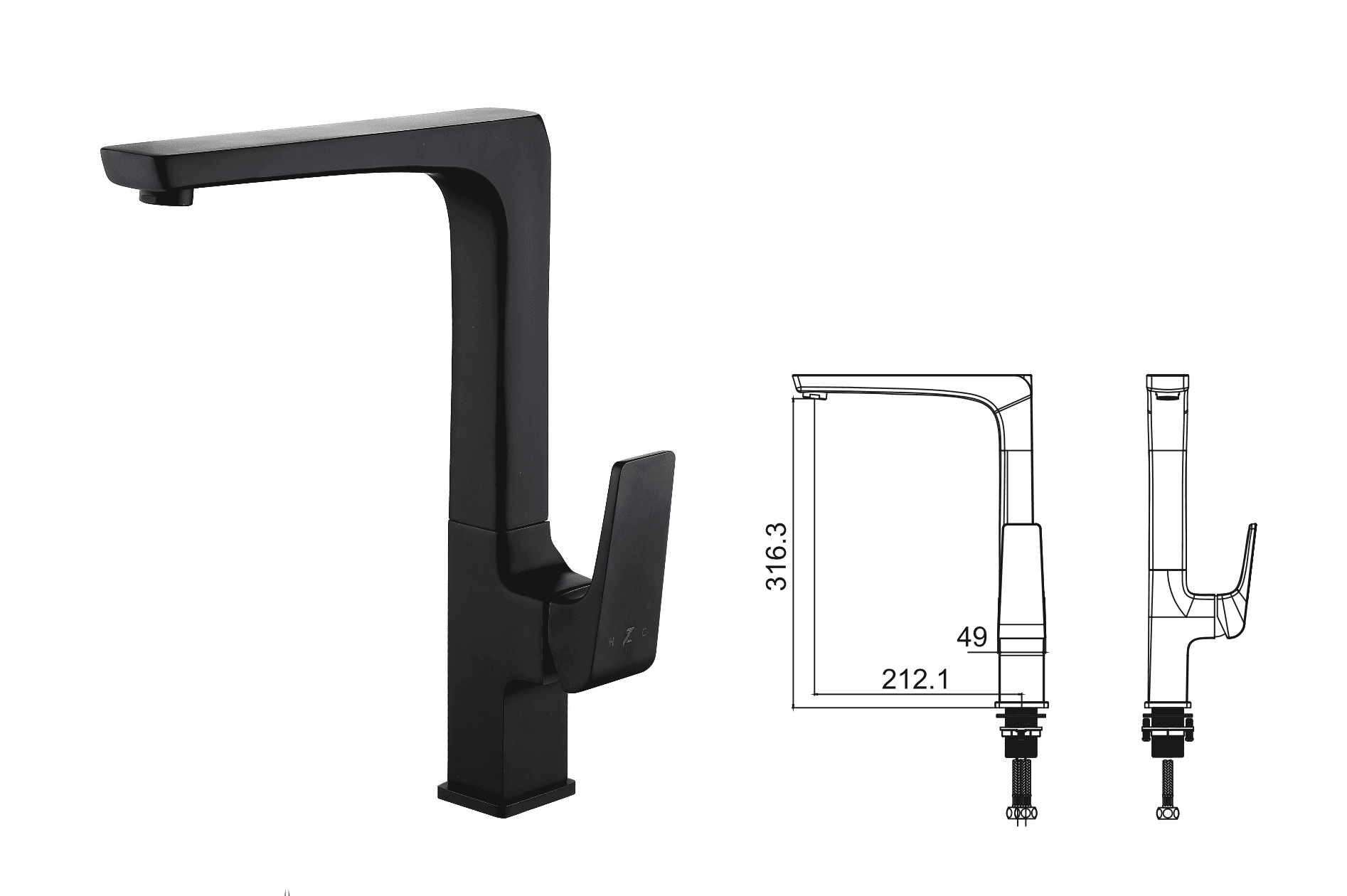 На изображении представлен смеситель чёрного матового цвета. Дизайн выполнен в современном стиле с чёткими геометрическими линиями — форма корпуса угловатая, лаконичная. Излив длинный, прямой, с традиционным профилем, выступает вперёд.